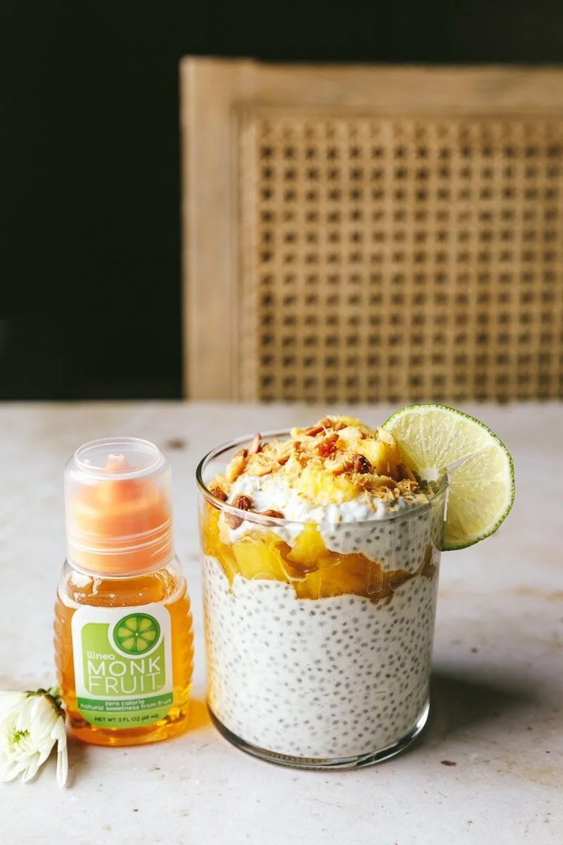 Make the pineapple compote (optional): Set saucepan over medium heat and combine the chopped fresh pineapple with the water, 1 tablespoon of lime juice, and 1/2 teaspoon llinea monk fruit. Cook for about 10 minutes or until the pineapple breaks down and the juices reduce. Let it cool.